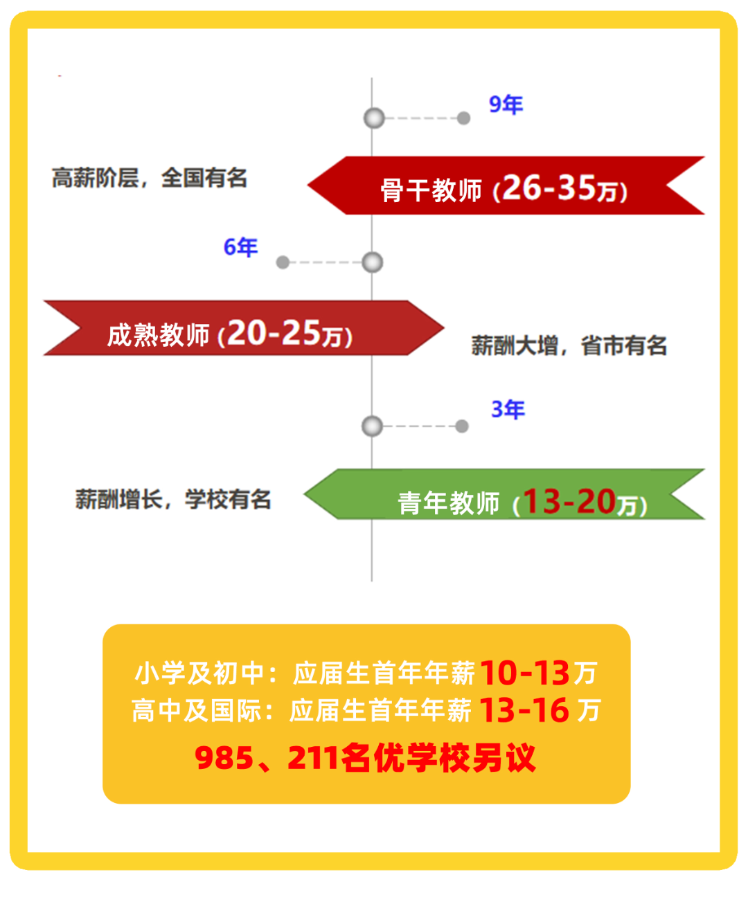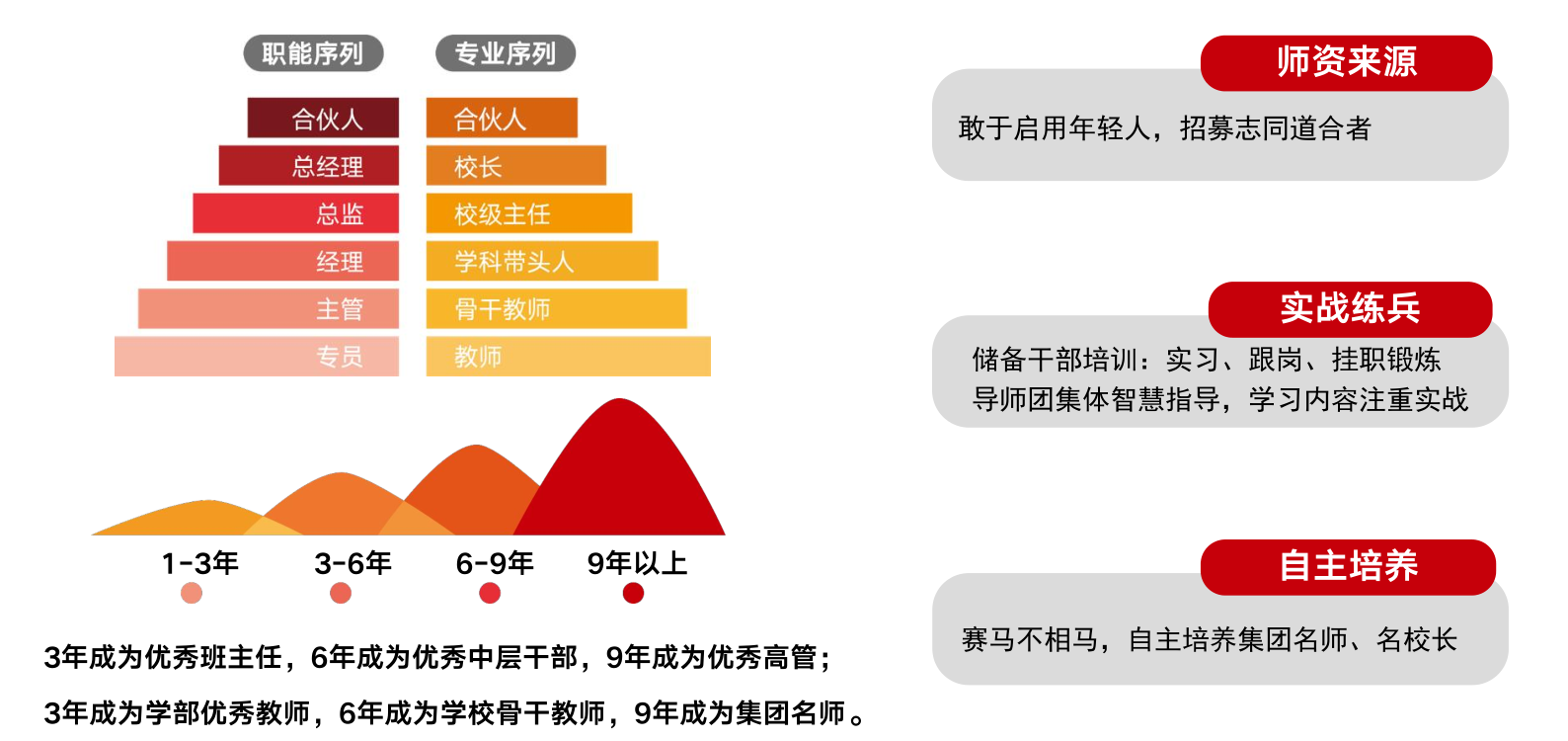 3年成为优秀班主任/教师,6年成长为骨于/中层,9年晋升为集团名师或**管理人才。